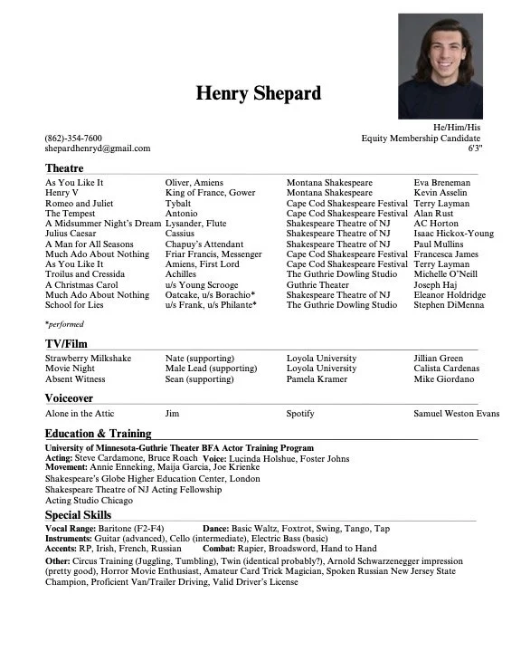 I am a Chicago-based, New Jersey-raised actor! Since graduating with a Bachelor of Fine Arts in Acting, I’ve spent these past few years working in regional theaters across the country. No matter where I find myself, I am always bringing my love for words and connection to every room.